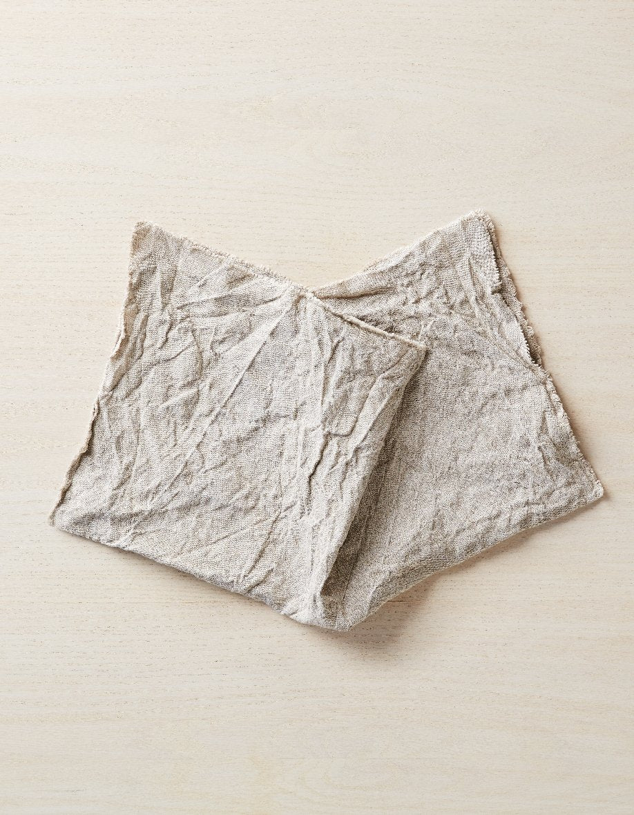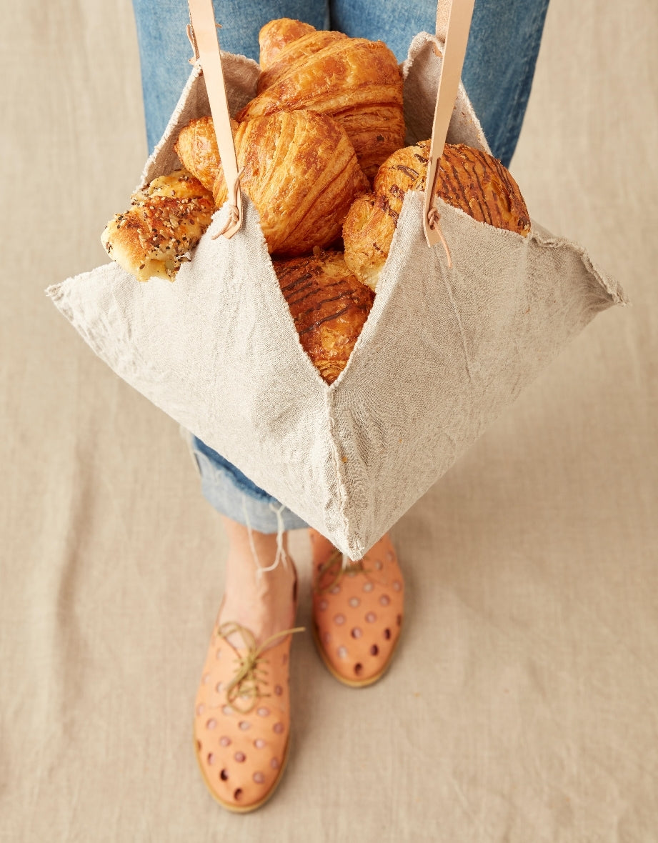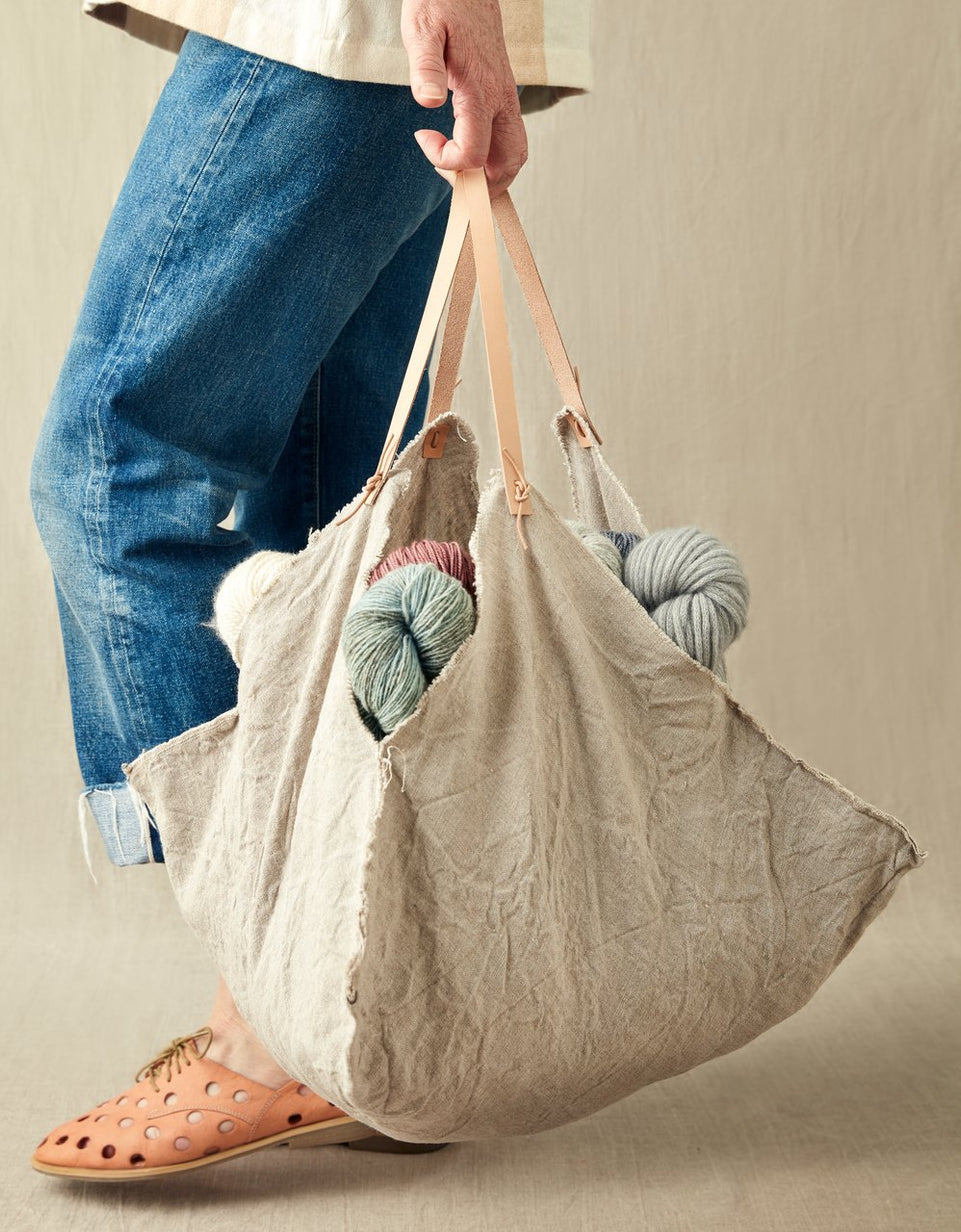 Through many years of teaching knitting, I’ve used and seen hundreds of project bags, usually the drawstring variety. I was frustrated with this classic bag design because it is too one-dimensional and difficult to get into. I wanted something I could open up and get to the bottom of, something I could hang on the arm of a chair and knit out of, plus something I could use for other purposes, such as transporting a box of pastries or my lunch! I began folding paper, origami-style, until I came up with a simple, square-bottomed, tote structure. Using this design, I constructed the bag with rustic, durable linen and natural, vegetable-tanned leather handles that are removable so the bag can be washed. The pattern for the bag comes with the handles so you can either sew your own, or buy the Cocoknits ready-made one. Either way, instructions are included for tying on the leather handles so when you spill wine, coffee or anything on your bag, no problem! Remove the handles, wash the bag, and reattach!