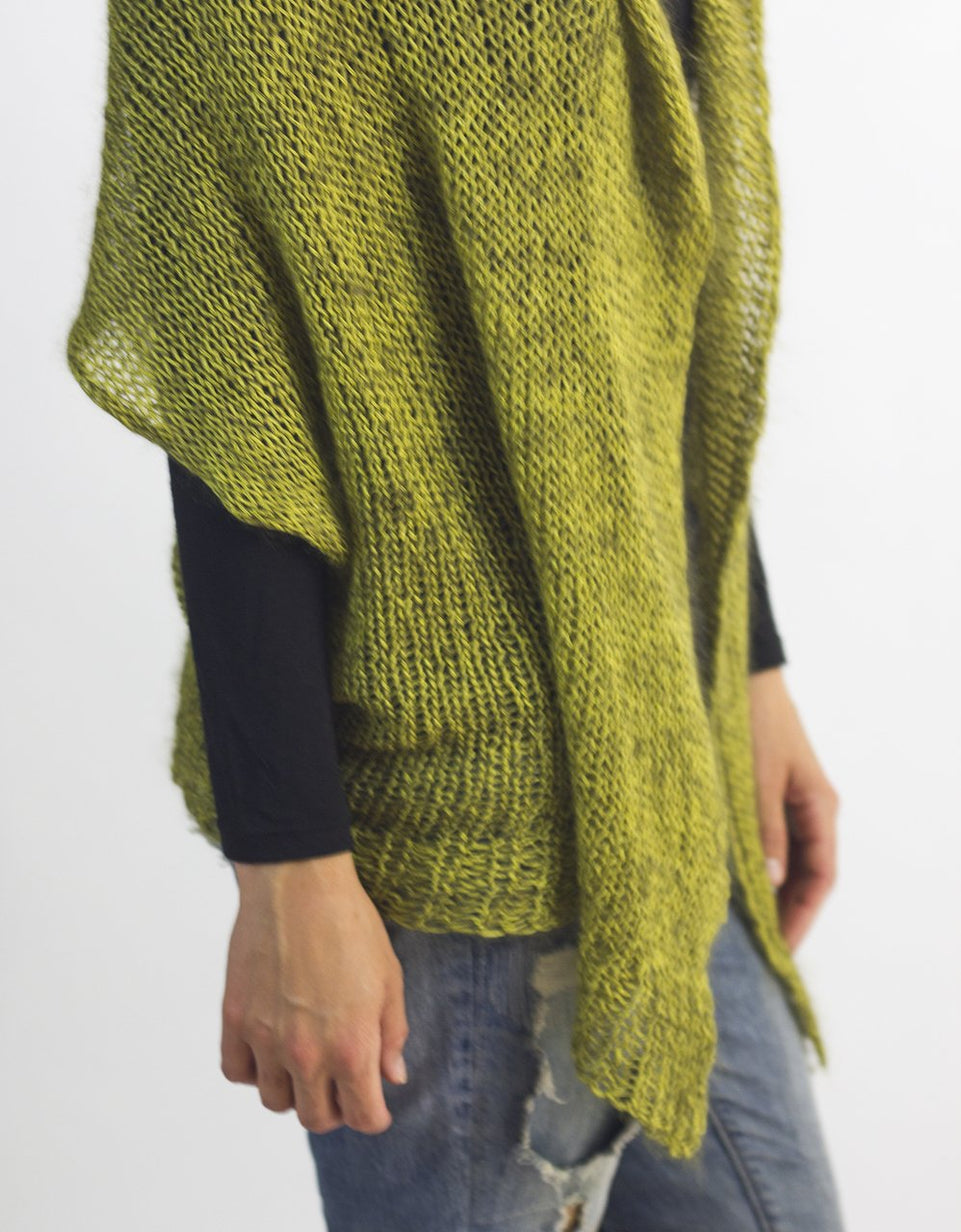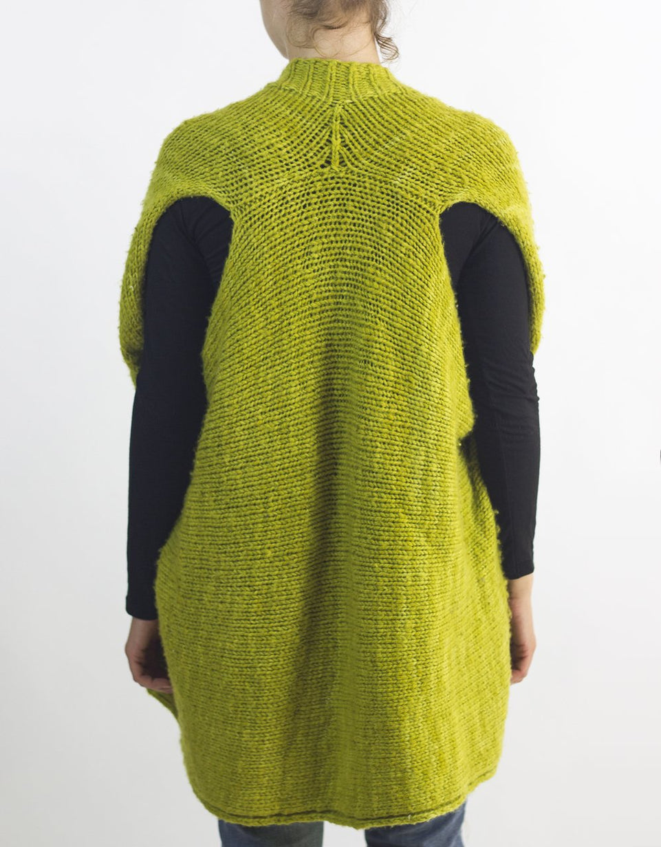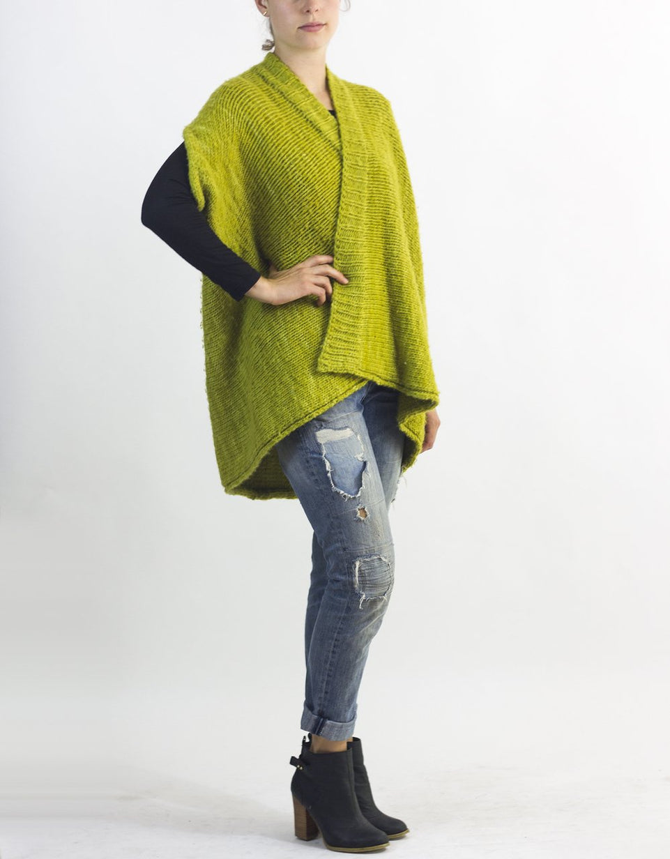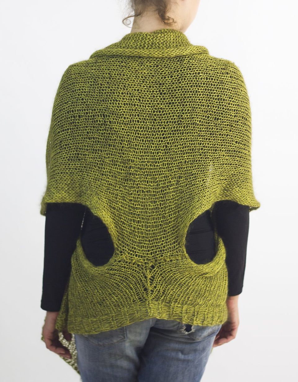 The cocoon wrap starts out as a big rectangle, but then you fold it and continue knitting to create armholes and a wide ribbed collar. What results is a cozy, versatile wrap. Worn one way, the fronts are shorter; worn upside down, the fronts become longer.