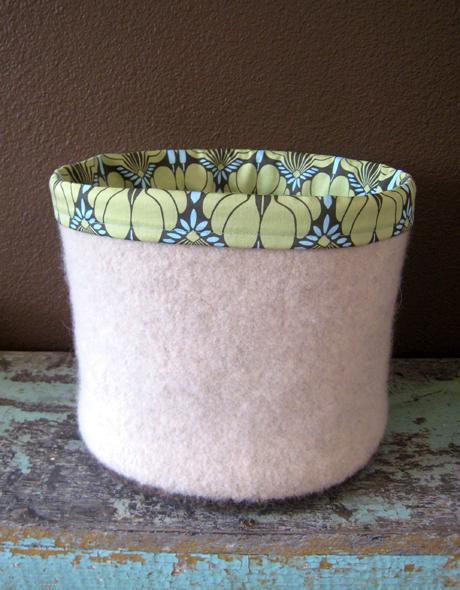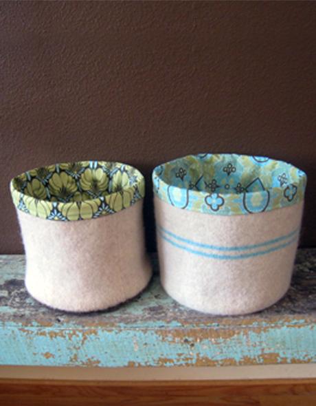 Need an attractive way to store your stash? These big felted buckets measure 9-10" tall by 11-12" in diameter. They look especially cute lined with Amy Butler fabric.