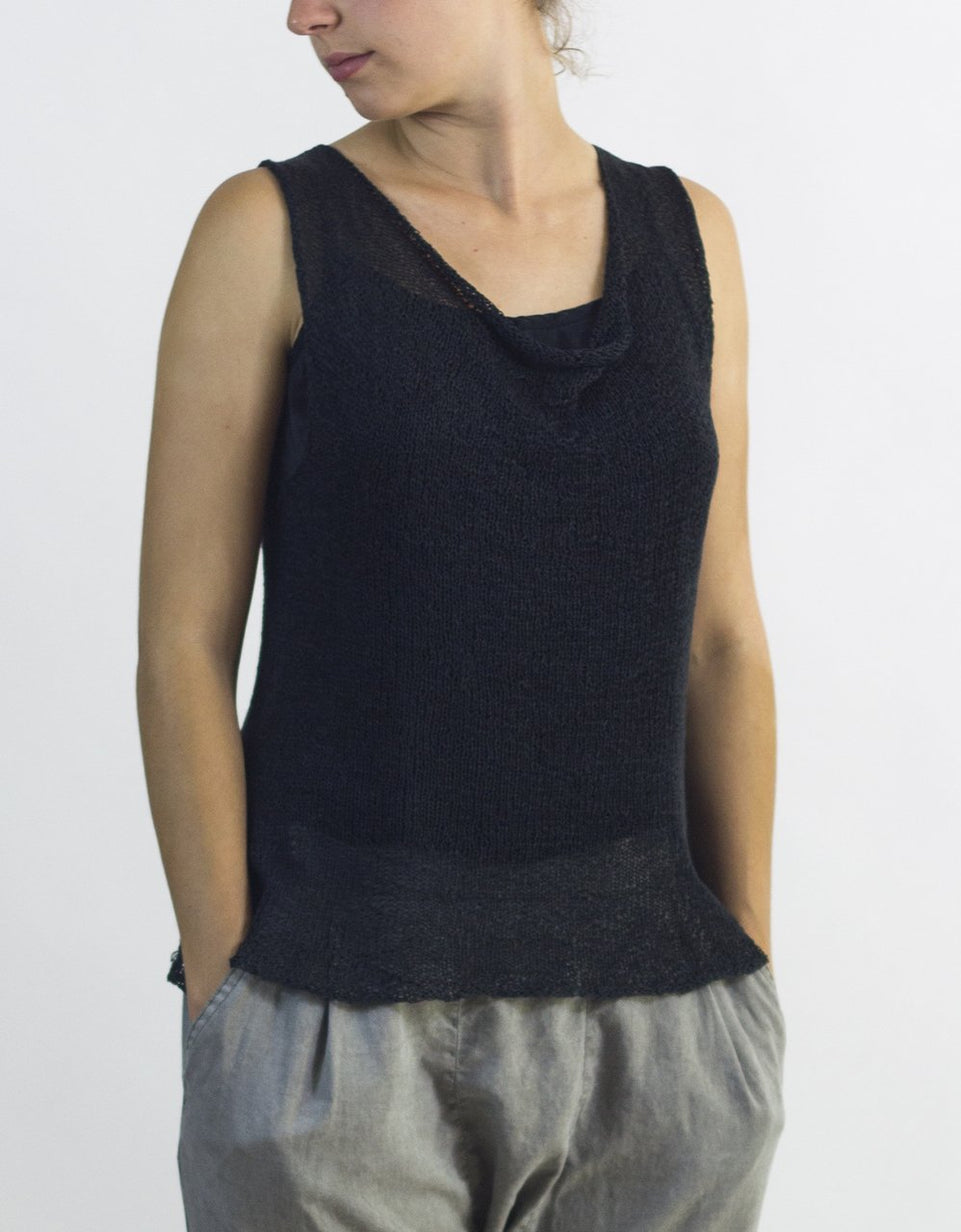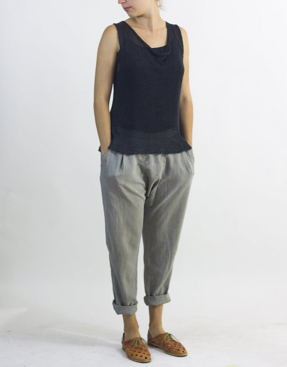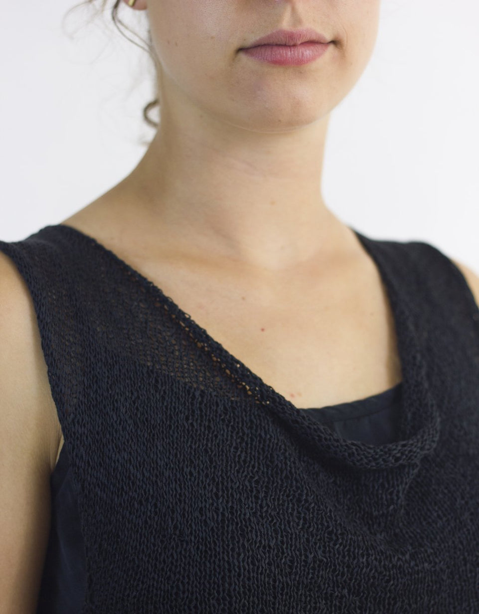 Gretel is a seamless, A-line tank with a flattering cowl neck. Quick, versatile and, like Gisela, a good value. For the medium size, Gretel required just 2 skeins of Habu's Cotton Gima. You may need to knit her in several colors!