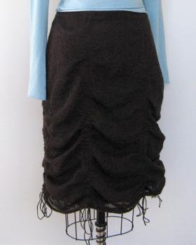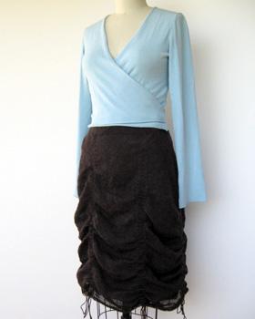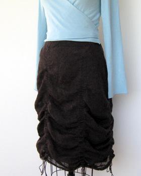 Ilse is an easy knit with dramatic results. The stainless steel and wool give the skirt wonderful texture and body. Six crocheted cords run down the skirt and tie at the bottom allowing you to customize the ruching.