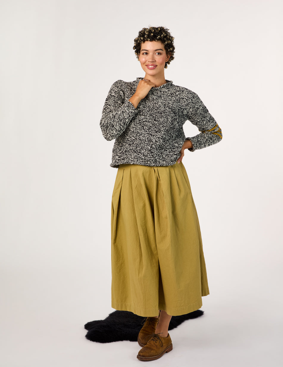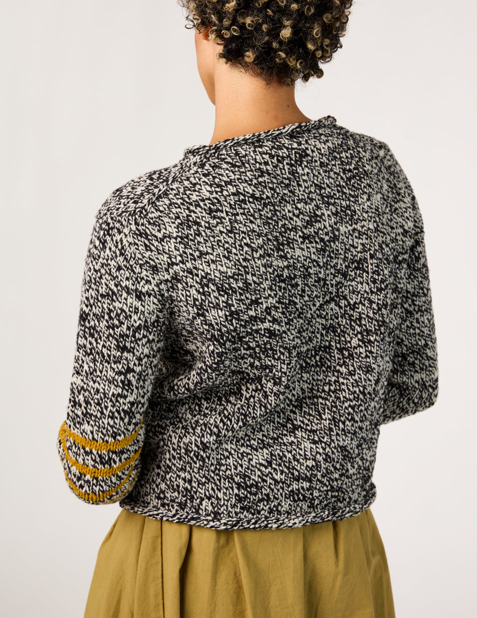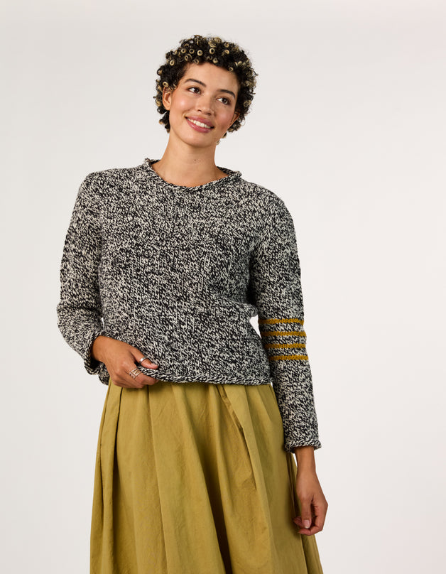 “Many years ago I designed a simple pullover with rolled edges on the neck, cuff, and hem for Melanie Falick’s book Kids Knitting. It was simple looking, but not so straightforward to knit as it was knitted in pieces from the bottom up and seamed. For years I have been wanting to recreate it top-down and seamless. This was the inspiration for Jane, and the stripes take it to another level, an elevated everyday staple.” —Julie