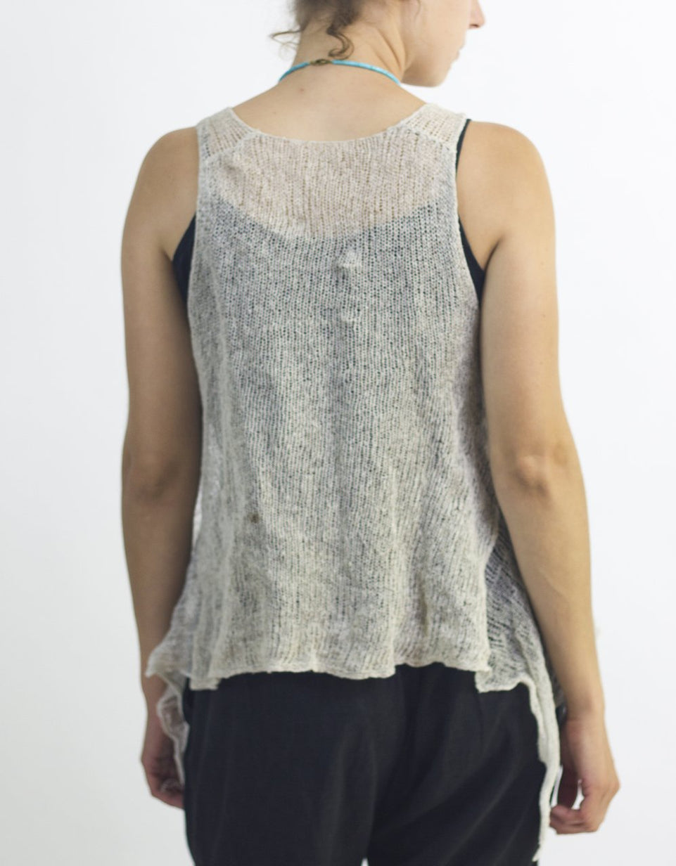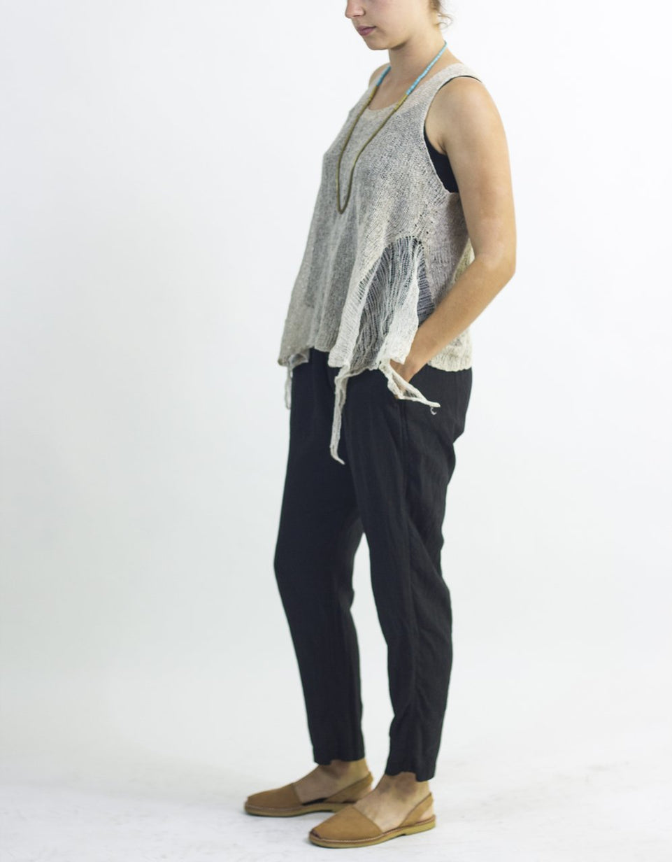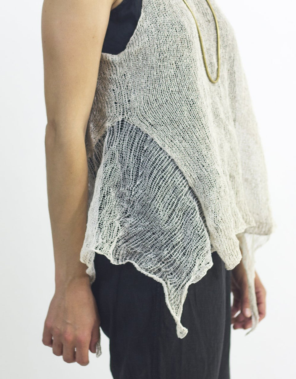 Ruby is a fun, light weight summer knit. The body is knitted with two thin strands of Habu yarn while the side flounces are knitted with just one strand. This one is knitted with silk and linen but she'd be fun in any combination of silk, stainless steel, paper, linen or wool.