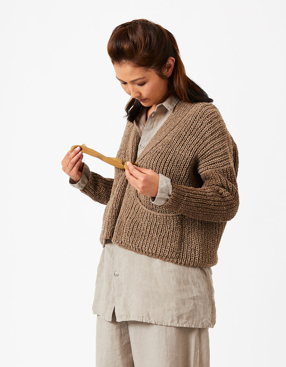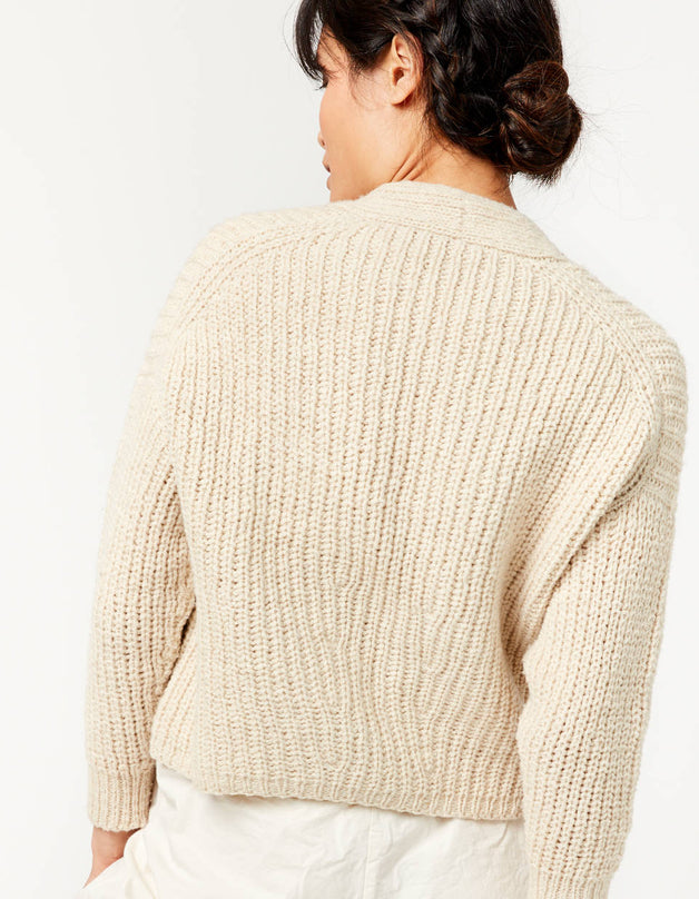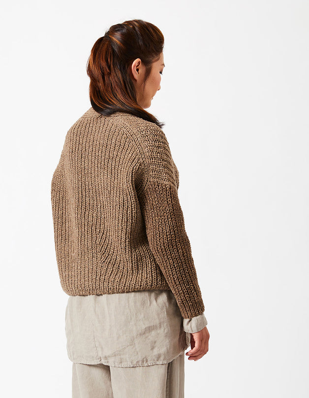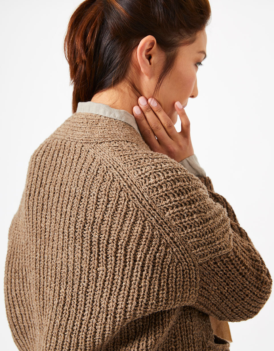 This pattern uses a modified Cocoknits Method, with the shoulder join dropped to the back. The sleeves, however, are picked up and knitted down from the armhole opening rather than as a seamless yoke. Sarah features the signature Cocoknits English tailoring with the front/back join pushed to the back, and a modified worksheet is included with the pattern..