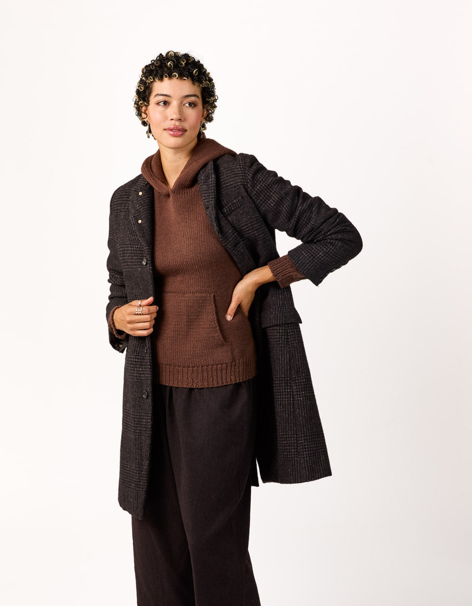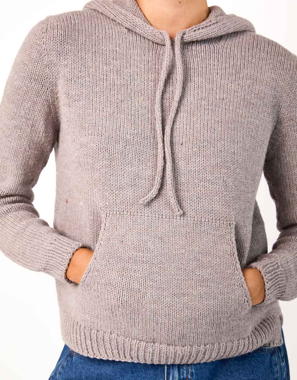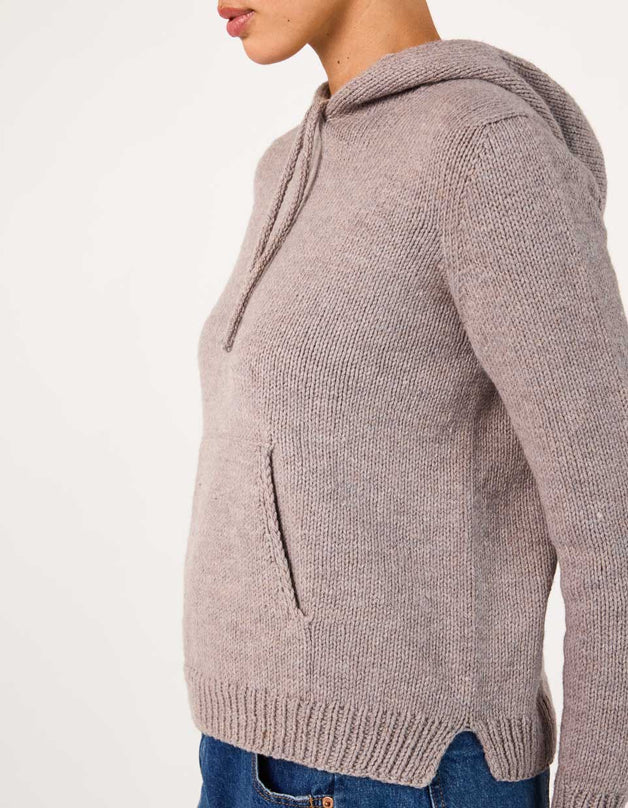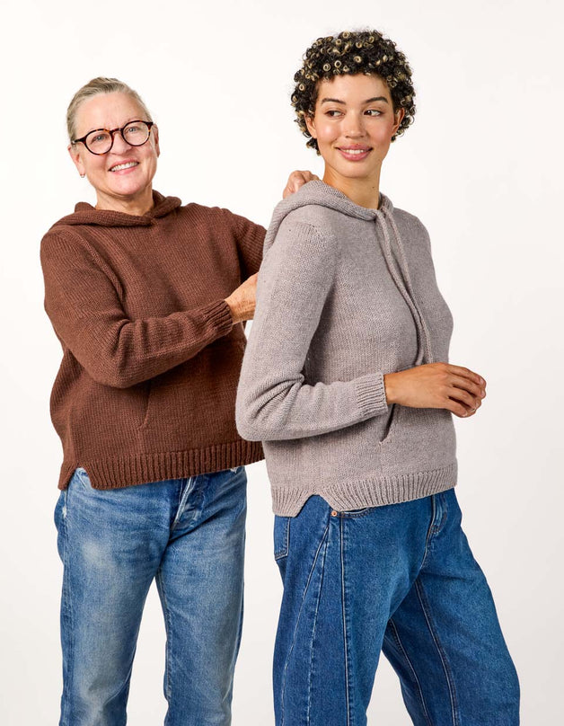 Tracy is a classic hoodie with handknit charm. The hood is worked from the top down with a neat I-cord edging (and room for an optional drawstring) and is then knit seamlessly into the signature Cocoknits Method. The cozy front pocket is picked up from the body and incorporated with a three-needle join. Two short sections of the pocket lining are whip stitched to the inside of the sweater. The split ribbed hem provides extra movement and comfort at the hips. Although Julie doesn’t like to wear hoods herself, her long-time friend and Cocoknits team member, Tracy, loves a good hoodie. It was only fitting that our first hooded sweatshirt be named after her!