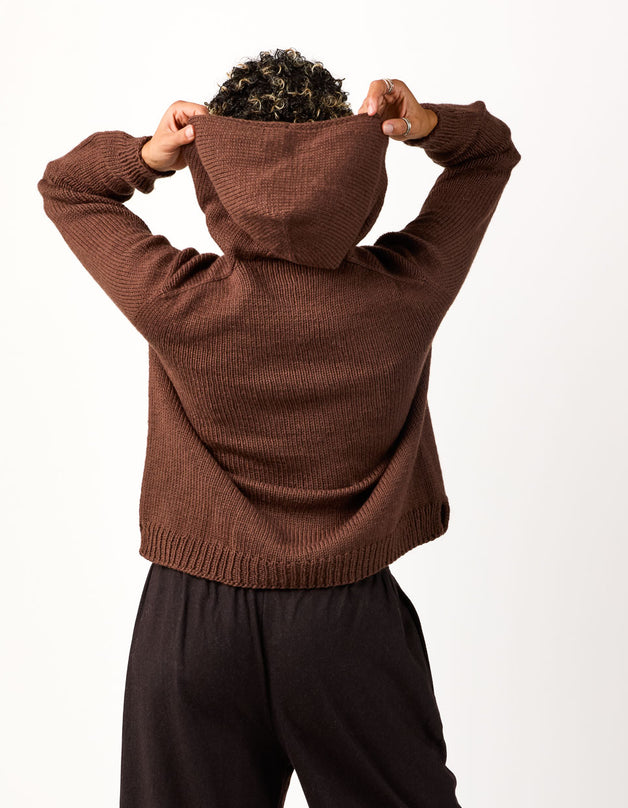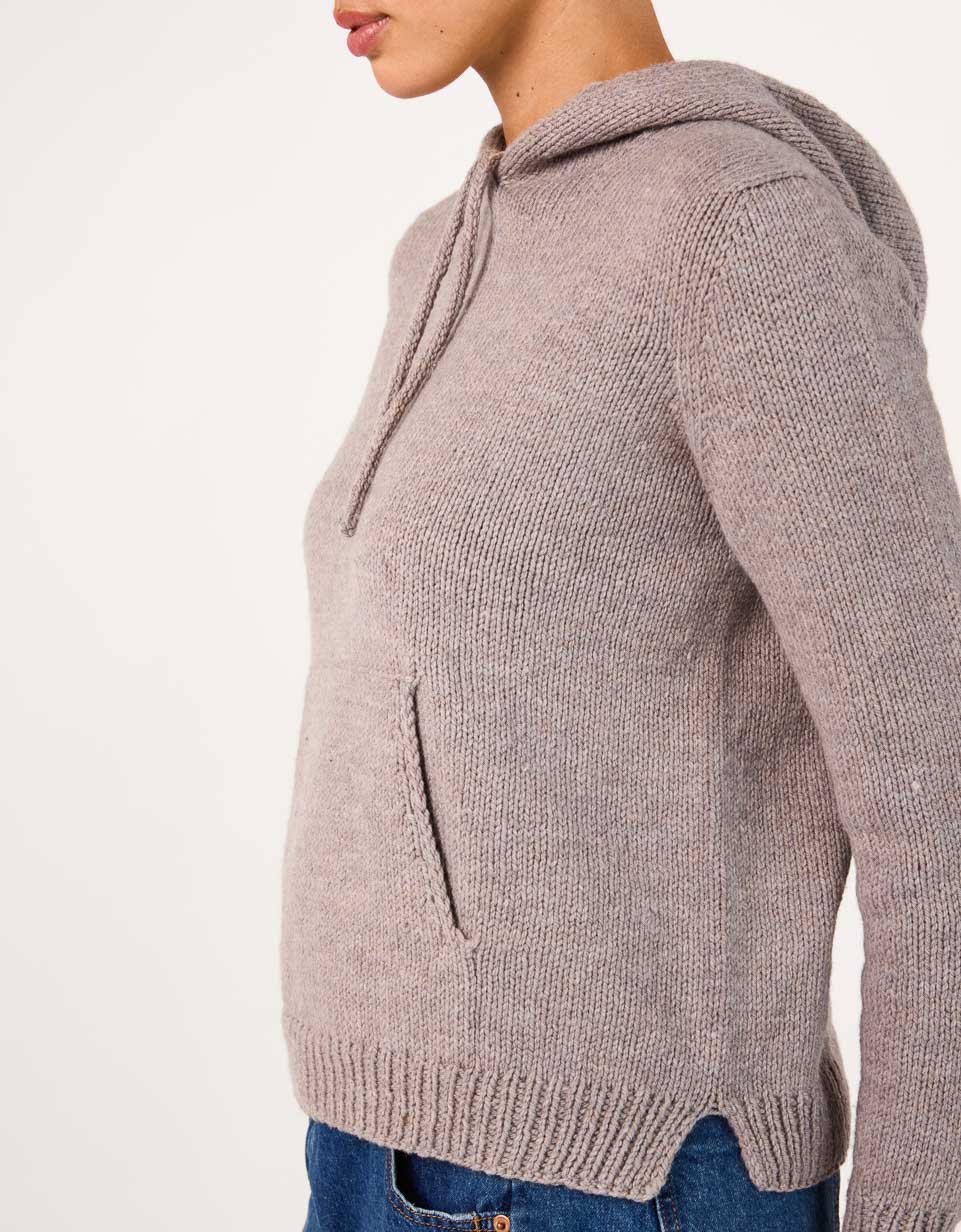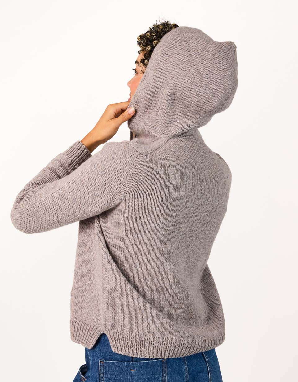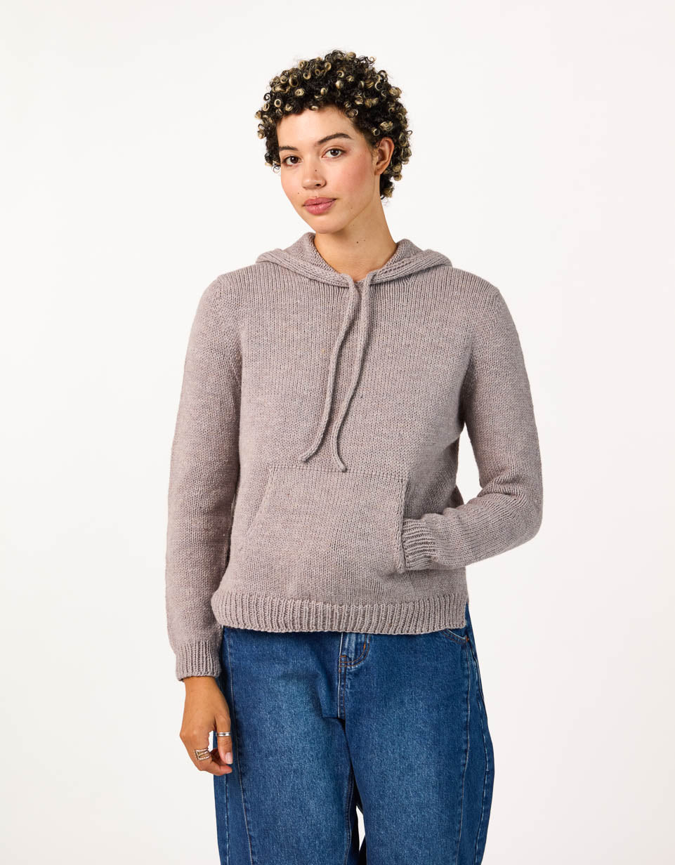 Tracy is a classic hoodie with handknit charm. The hood is worked from the top down with a neat I-cord edging (and room for an optional drawstring) and is then knit seamlessly into the signature Cocoknits Method. The cozy front pocket is picked up from the body and incorporated with a three-needle join. Two short sections of the pocket lining are whip stitched to the inside of the sweater. The split ribbed hem provides extra movement and comfort at the hips. Although Julie doesn’t like to wear hoods herself, her long-time friend and Cocoknits team member, Tracy, loves a good hoodie. It was only fitting that our first hooded sweatshirt be named after her!