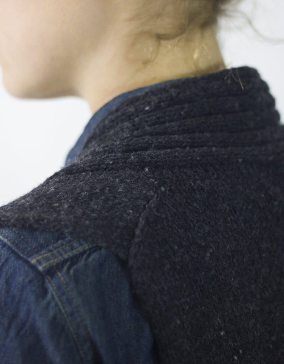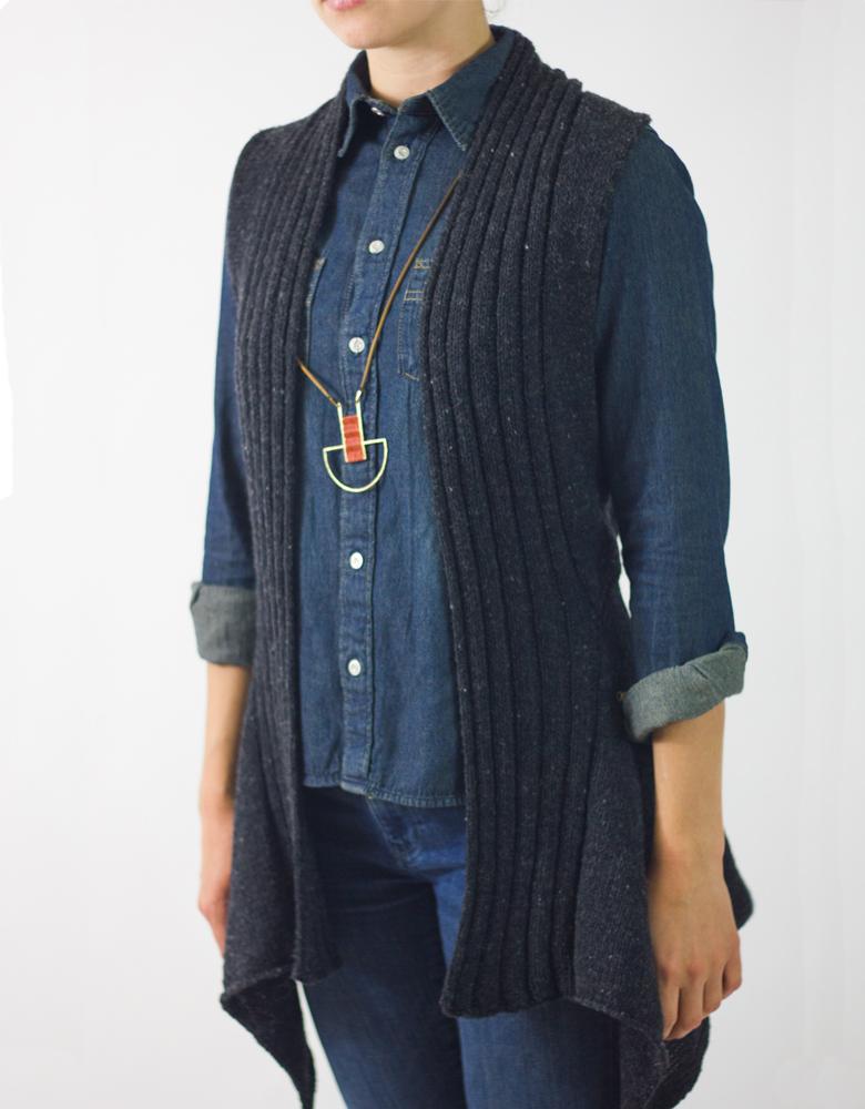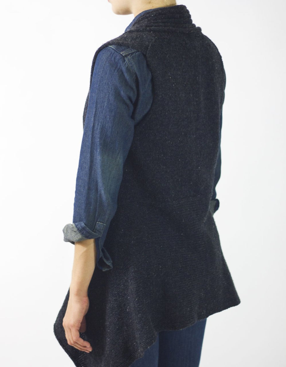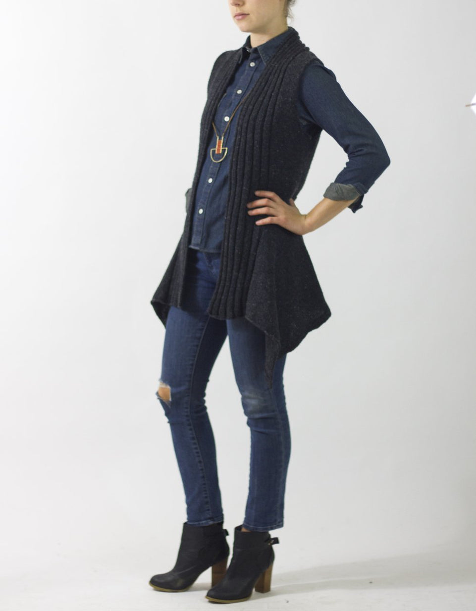 I originally worked Vertex in Loft for Brooklyn Tweed. It's also wonderfully flowy and weightless in this yarn from A Verb for Keeping Warm. Vertex makes a great top layer to add some vertical lines to the figure. It's knitted bottom up, requires kitchener st but only two little seams connect fronts to back at the shoulders.