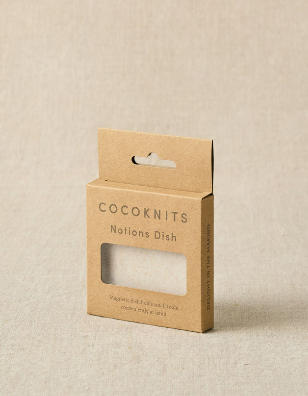 It is made of PLA (100% biodegradable plant fiber) and is petroleum plastic-free. An embedded magnet keeps your metal Cocoknits notions secure and can also hold the Cocoknits Notions Cup and sit on the Cocoknits Notions Tray (sold separately). The pleasantly curved angle at the edge of the dish allows easy retrieval of stitch markers that are held by the magnet.