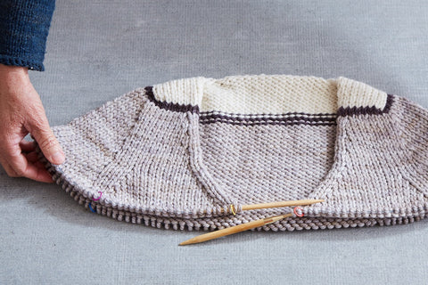 Stitches are worked across the left shoulder, picked up to create the left sleeve, worked across the back, picked up to create the right sleeve, and worked across the right shoulder. This is also where you will place colorful stitch markers to delineate each part of the sweater yoke. The colors will correspond to the vertical lines on your Cocoknits Worksheet in Section IV.