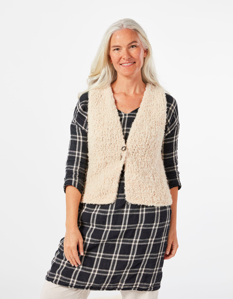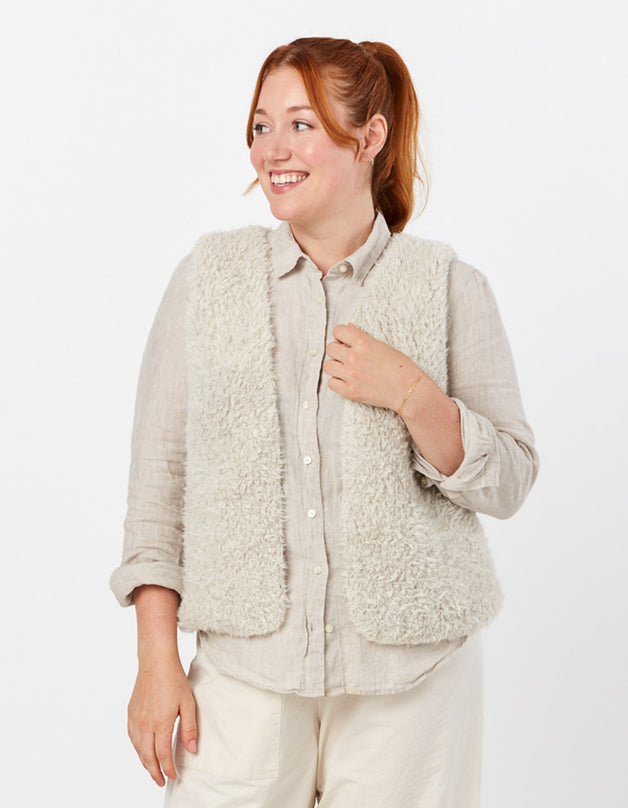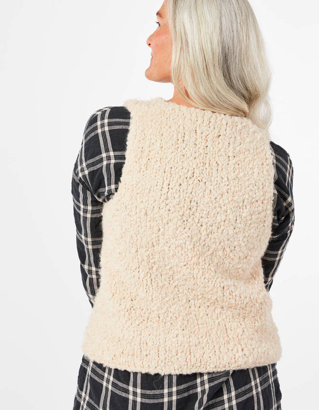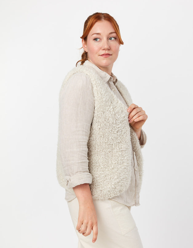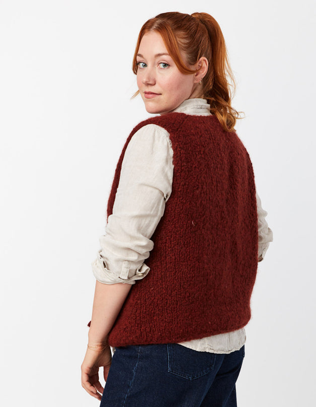 This vest is worked using a modified Cocoknits Method, a commonsense system for knitting seamless, tailored sweaters from the top down. The Cocoknits Method is explained in detail in Cocoknits Sweater Workshop by Julie Weisenberger, in her On Demand Classes, and in tutorials on cocoknits.com.