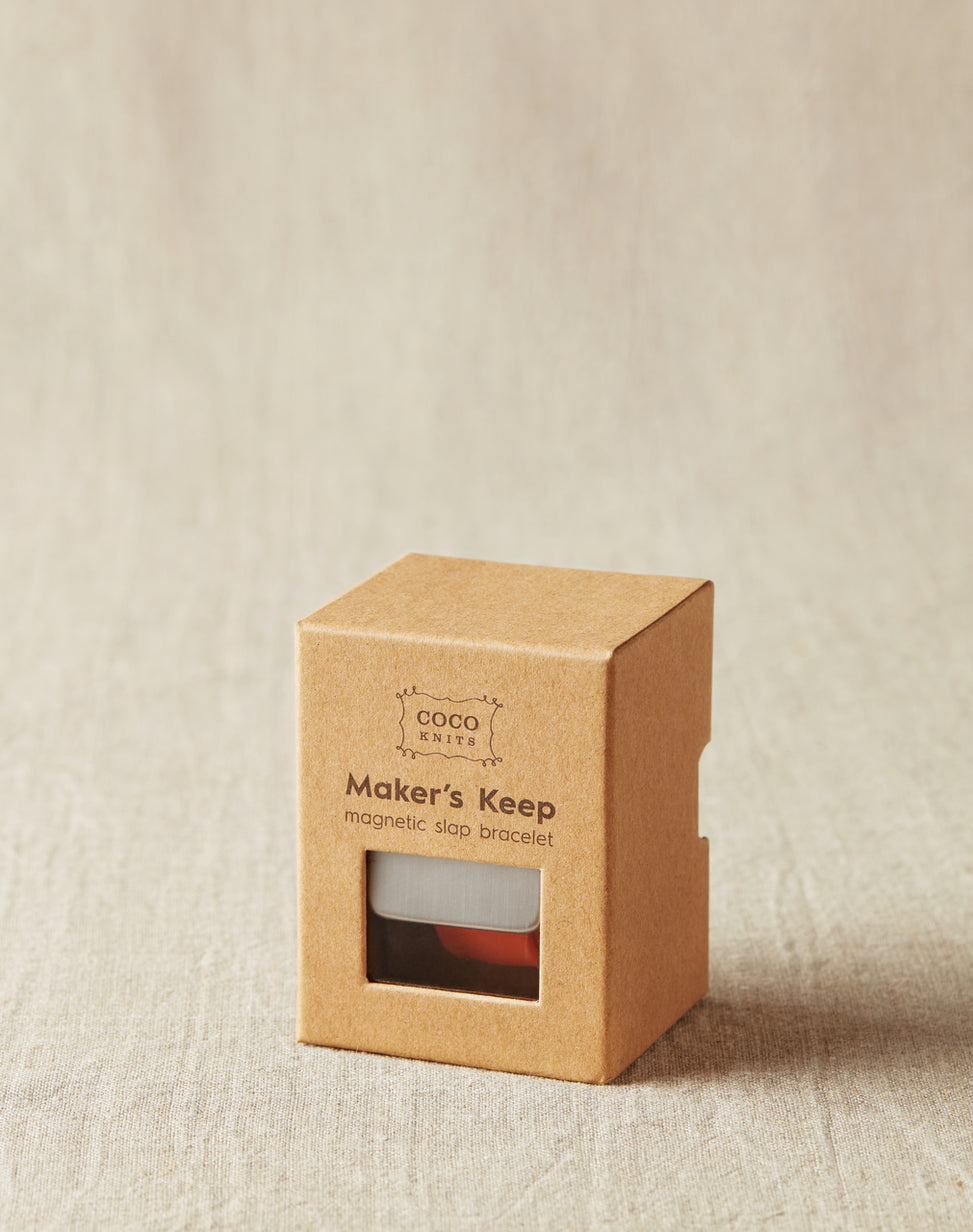 One of the many advantages to knitting is that you can take it with you everywhere! And, in the process, lose little knitting notions everywhere! I wanted a way to truly contain all my knitting tools while traveling – so I came up with the Maker’s Keep magnetic bracelet. It is a slap-bracelet so it fits everyone (one size truly fits all here). You can wear it, or simply drop it in your knitting tool bag to keep all the tools together – or even unfurl it and push the magnet to one end to use it as a straight edge while reading down a pattern.