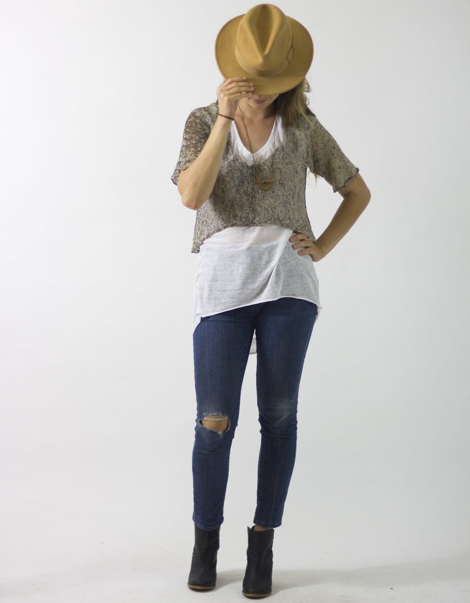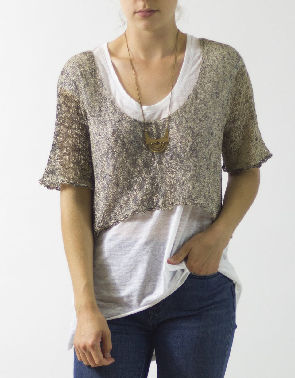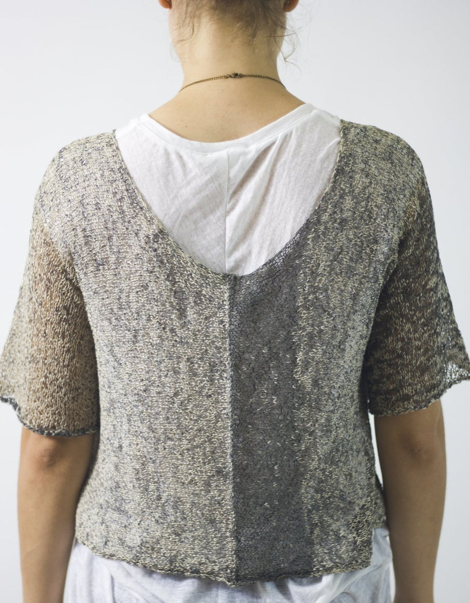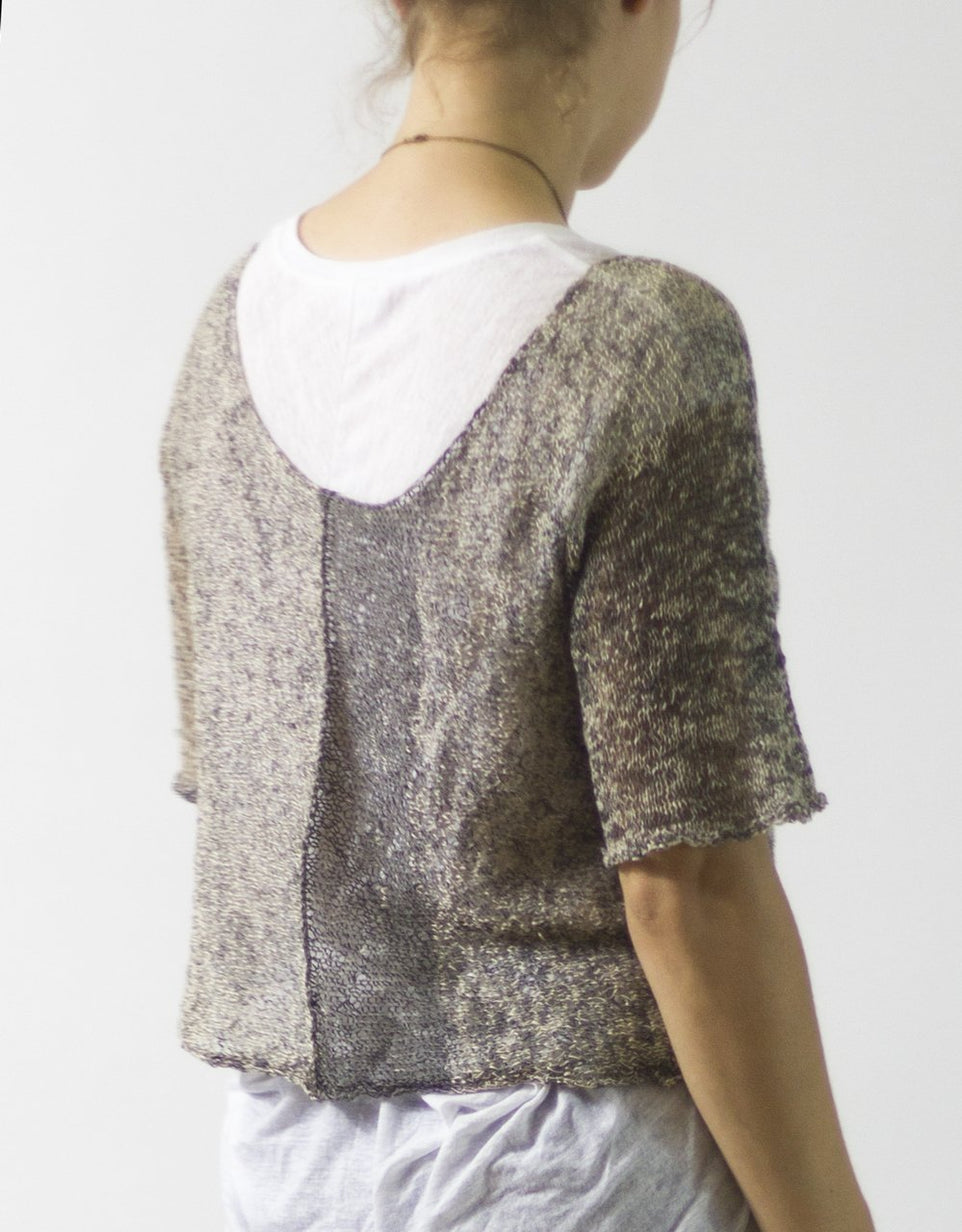 Paulina is a good layering piece when wearing a tank alone feels a little too exposed. It's also a great way to use printed cotton gima from Habu but works well with many solid or hand-dyed lace to dk weight yarns. She is knitted flat in two pieces from the cuff toward the neckline. A 3-needle BO worked on the RS creates an exposed seam up the front of Front and Back.
