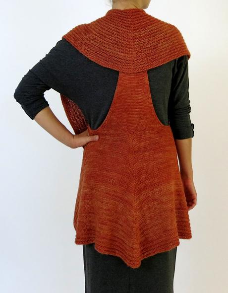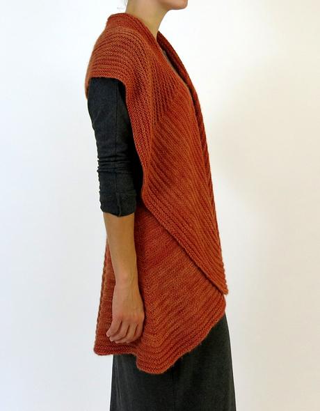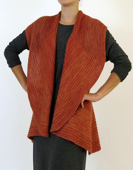 Yvonne is somewhere between a shawl and a cardigan; the perfect lightweight garment for air conditioning or cool evenings. I have seen this on all body shapes, from 5' tall 32" chest to 5' 11 tall 52" chest and it is universally comfortable and flattering. Its simple shape really shows off a gorgeous, drapey yarn.